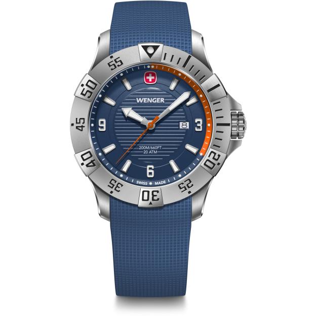 Швейцарские мужские часы Wenger SEAFORCE W01.0641.140 на синем силиконовом ремешке. Спортивный дизайн в стиле дайверских часов. Прекрасный выбор, если вы ищете качественные часы с ярким внешним видом для активного образа жизни и занятий водными видами спорта.