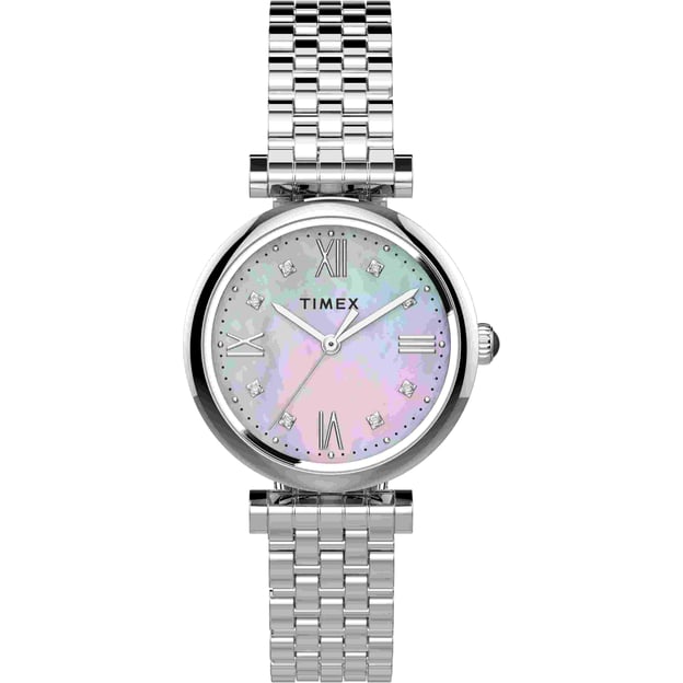 Женские часы Timex PARISIENNE Tx2t78700 - элегантная модель на стальном браслет серебристого цвета. Изюминка модели - циферблат из перламутра, для которого характерна неравномерная текстура, а цвета меняются в зависимости от угла обзора и освещения. Циферблат украшен кристаллами Swarovski, что придает часам особый шарм в стиле французских модниц. Прочный латунный корпус качественно защищает кварцевый механизм, работающий на сменной батарейке.
