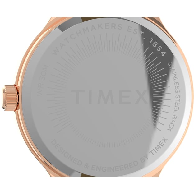 Timex Peyton TW2V06700 — женская классическая модель с аккуратным круглым корпусом 36 мм. Латунный корпус в оттенке розового золота и белый циферблат выглядят сдержанно и легко сочетаются с разными образами, а аналоговая индикация остается максимально понятной.
