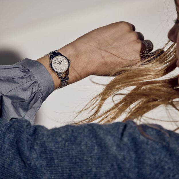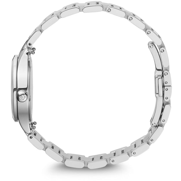Сапфировое стекло с антибликовым покрытием хорошо защищает циферблат от царапин. Водозащита 10 ATM (100 м) делает модель более уверенной при контакте сводой. Серебристый стальной браслет поддерживает общий сдержанный образ, а диаметр корпуса 28 мм смотрится компактно на запястье.