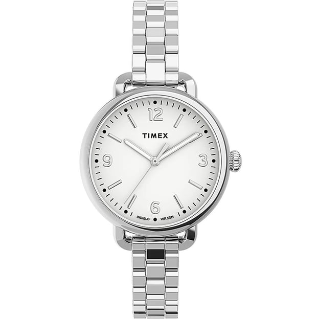 Timex Standard Demi Tx2u60300 дополнены серебристым корпусом, жемчужно-белым циферблатом и браслетом из нержавеющей стали.