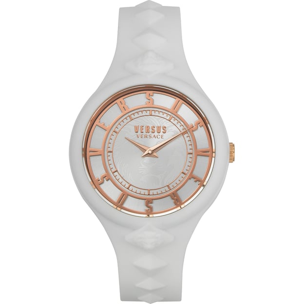 В них тисненые буквы VERSUS отображают временные индексы на циферблате молочного оттенка.